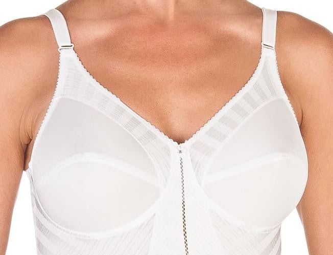 Stevig corrigerende body zonder beugels. Aan de voorzijde bevindt zich een ladderstiksel. Deze schijnt niet door in de kleding. De stof bevat een ingeweven streep. Gemaakt van het materiaal weftlock. Dit is een super licht materiaal dat én stevig is én vocht doorlatend.